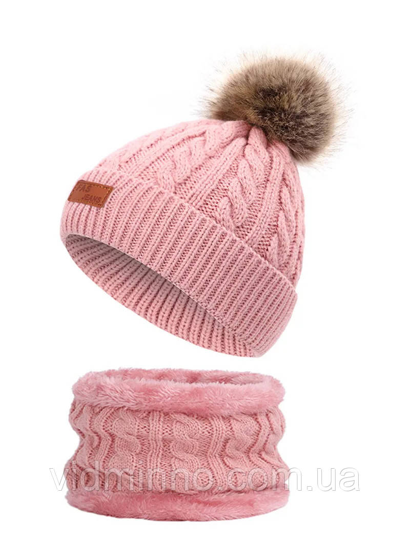 Дитячий комплект на дівчинку. Комплект з шапка біні зі снудом бафом. Зовні набір з в´язки. Шапка без утеплення з бубоном. Баф зсередини утеплений пухнастою махровою тканиною (імітація штучного хутра). Набір гарно тягнеться.